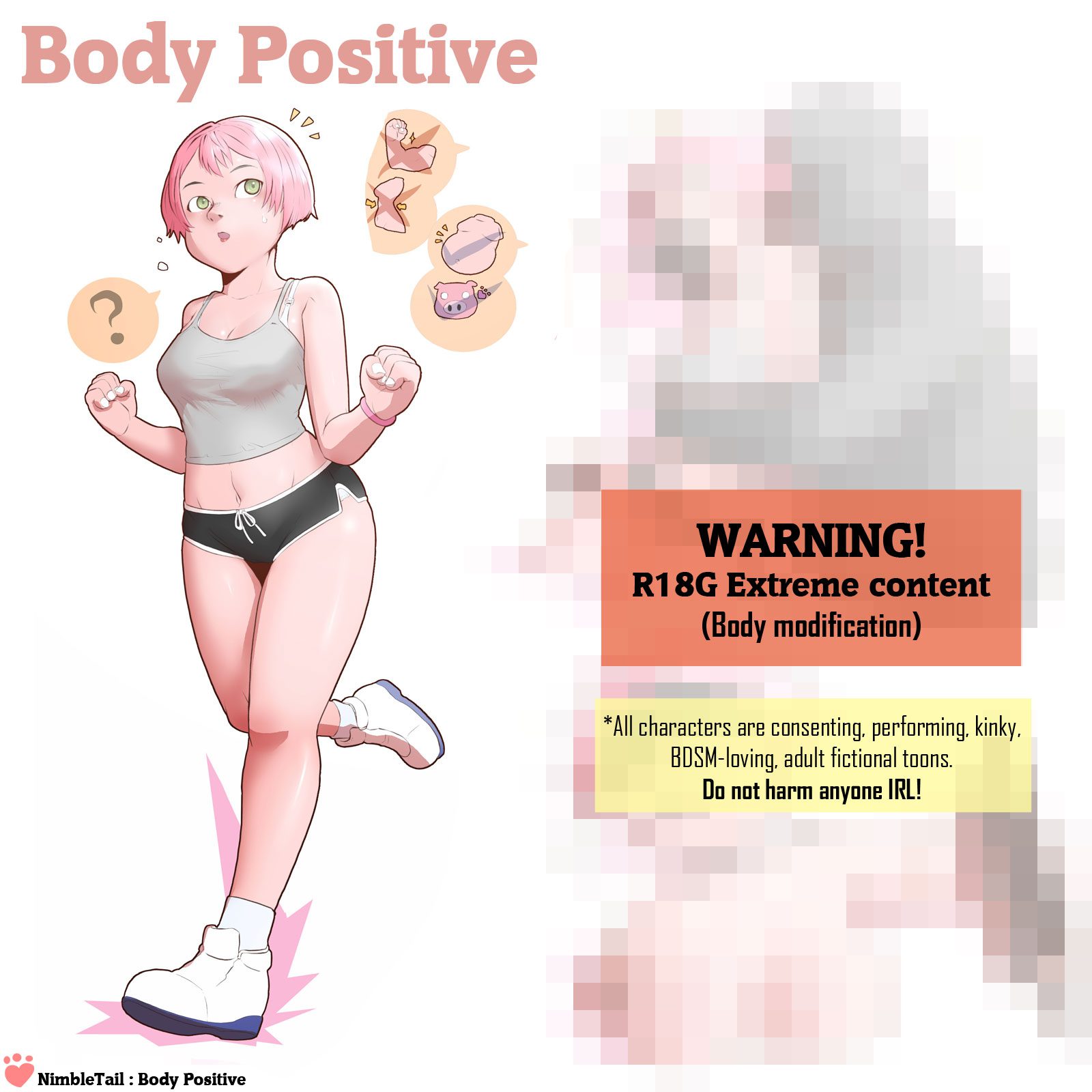 (Warning: Extreme body modification!)Hi, y’all!Here’s a new set! It’s about some cartoonishly toxic body positivity and it’s quite extreme^^” So we’re not doing a shout out on this one^^”Let me