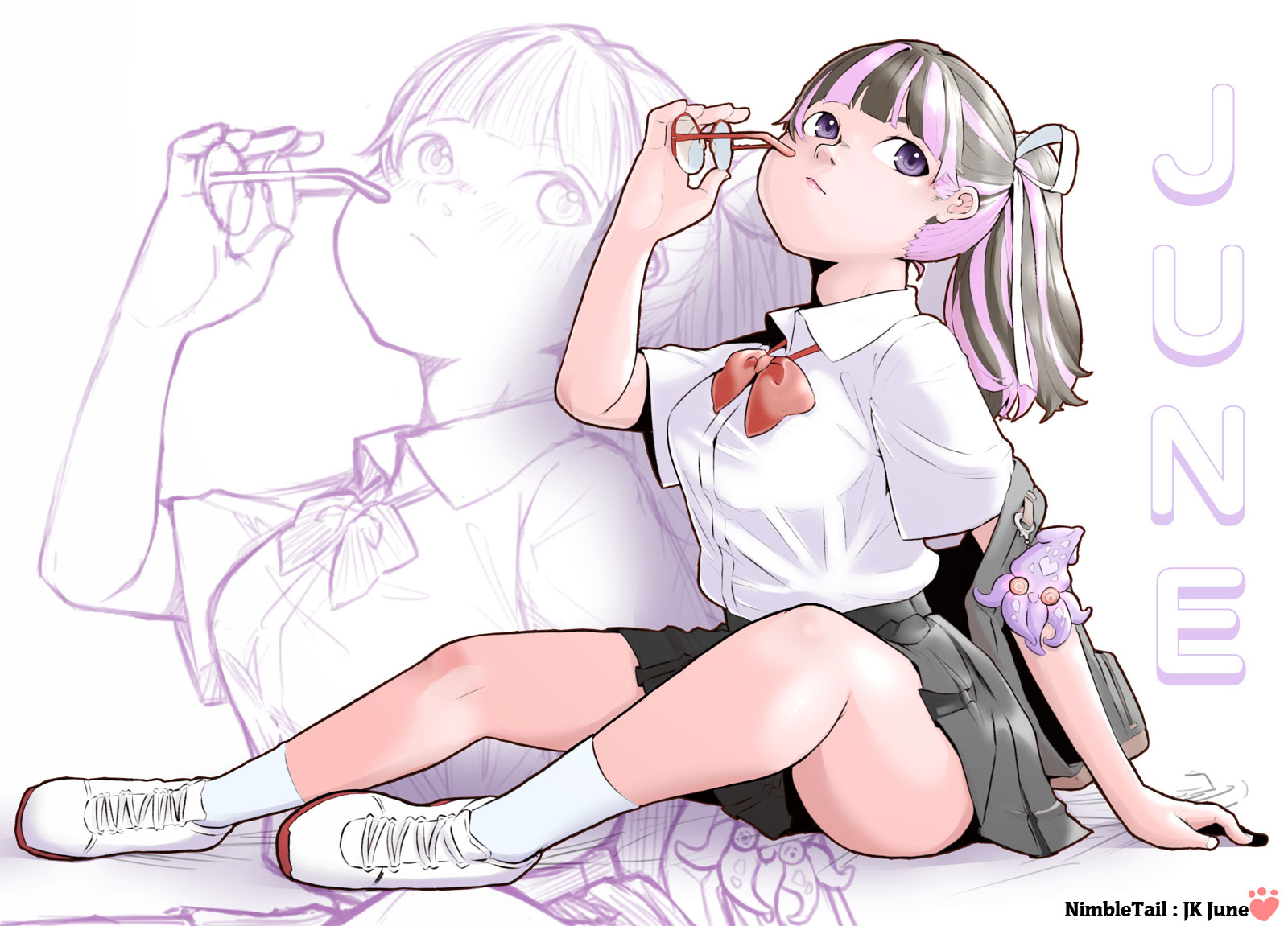 Hi, y’all!Here’s a random SFW pic of June I made!JK stands for 女子高生 (joshi kōsei, ja:女子高生), a female high school student, btw.June is canonically 21 so she is just cosplaying