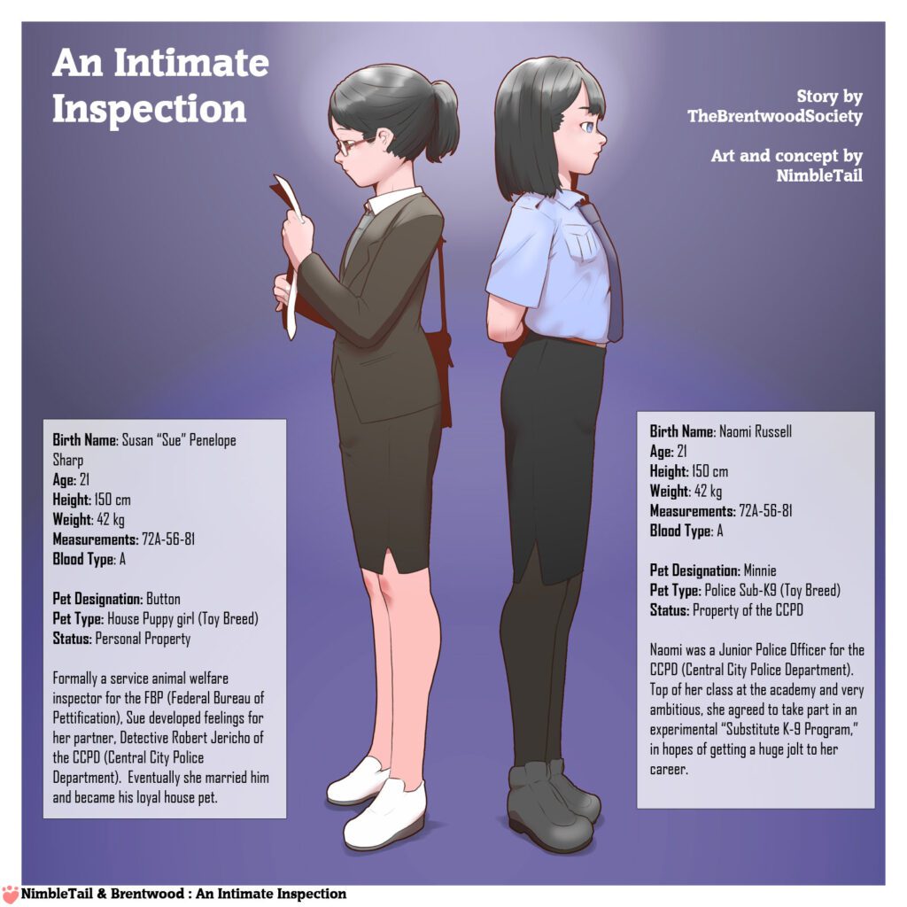 Security at the Federal Bureau of Pettification Headquarters (FBP) in Central City had been getting tighter and tighter in response to increased terrorist activities by anti-ComPet (Compulsory Pettification) groups. So, it was no surprise to the petite puppy girl, Button, that there was a new security checkpoint in the building’s lobby. What did surprise her was who was doing the checking.