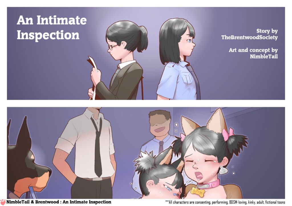 Though they were nearly identical, their pet gear was quite distinct from each other. Button was “dressed” in her usual light brown, Pomeranian inspired ensemble of soft, fuzzy paws over her hands and feet, pointy ears clipped to the top of her head, a pink collar around her neck, and a fluffy tail attached to a “runt-sized” plug inserted up her unaccommodating backdoor. The other puppy girl wore a police blue set consisting of pointy ears in the style of a German shepherd, with a badge-shaped name tag hanging from her collar that read “Sub K-9 Minnie.” Over her small, perky breasts, she wore an almost transparent, bone-shape piece of material with the word “Police ” stenciled across it in bold white letters. Button would have been jealous that the girl got a little more covering than her if she hadn’t been distracted by the other pet girl’s lack of a c-string between her “hind legs.” Minnie’s “puppy parts” were out in the open air! Scrutinizing the other puppy girl’s drippy, little slit, Button wondered if that meant the police puppy got to paw herself whenever she wanted.
