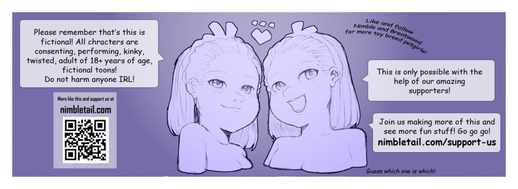Button’s jaw dropped as she saw the large, terrifying dog deposit the drooly end of the leash into Minnie’s mouth, before he bit the back of the puppy girl’s collar and dragged her towards a nearby janitor’s closet. The two, almost identical puppy girls made eye contact for a moment. Minnie had a look that Button recognized only too well. There was noticeable revulsion, anger, and even fear on her face, but all of those feelings were drowned out by unrelenting, terrible neediness.