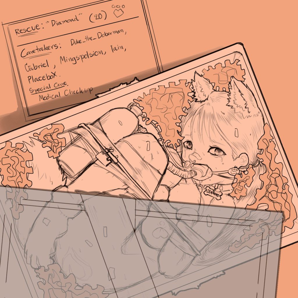 After another heinous attack on one of the obedience school’s off-site training session by an anti-pettification terrorist group where several staffs were injured, the word “FERAL” was spray-painted on the scene and a pupgirl in-training, Diamond was reported missing. Her tracking devices were all jammed and cannot be located. Thankfully, the young pup was found after a tip-off to the authority by a dutiful citizen who witnesses the smuggling in progress at night in the harbor area. Where the drugged and confused Diamond was about to be shipped off the country in a specialized signal-blocking container. Several perpetrators were arrested in the following raid and currently being interrogated. They will likely be sentenced to a swine treatment facility afterward.