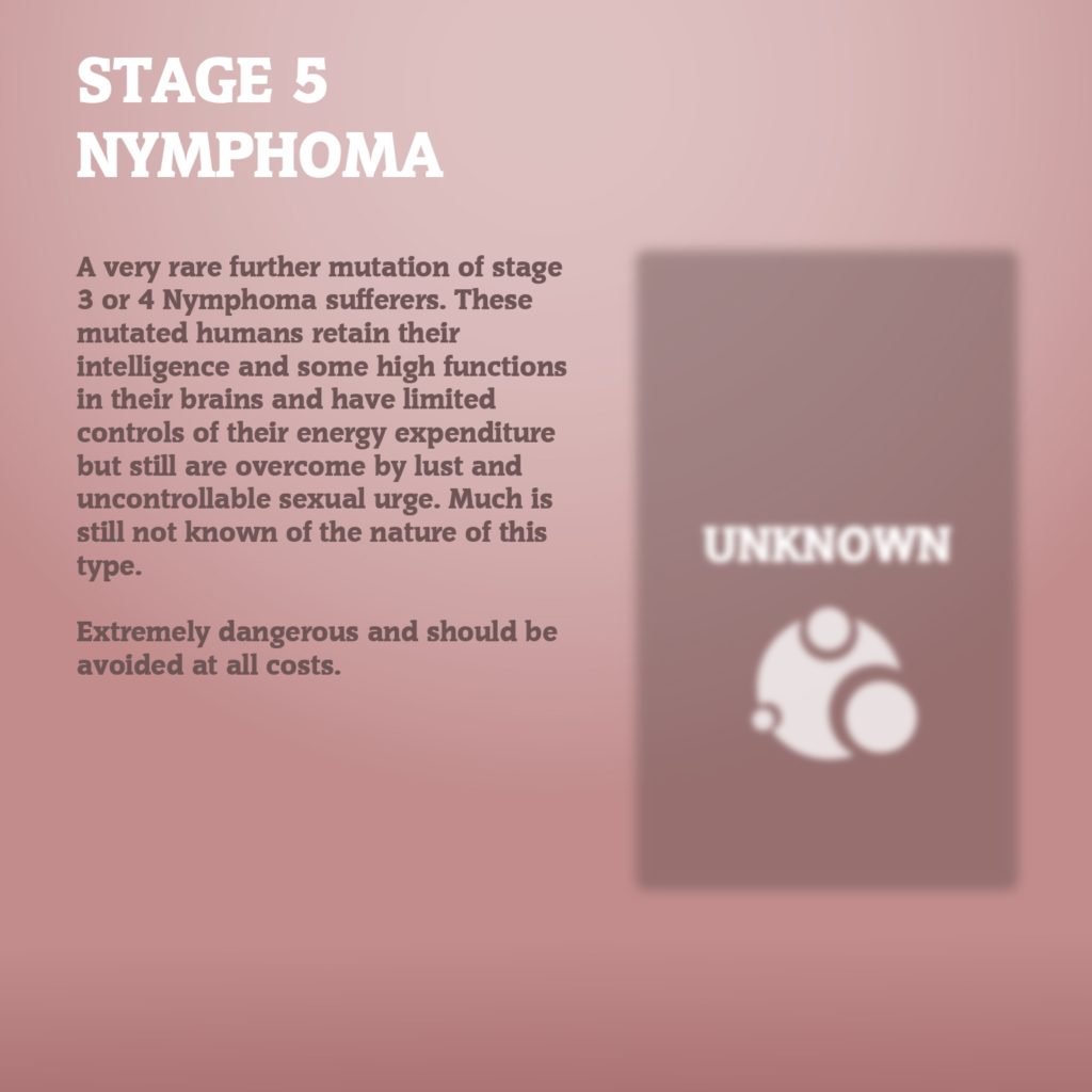 A very rare further mutation of stage 3 or 4 Nymphoma sufferers. These mutated humans retain their intelligence and some high functions in their brains and have limited controls of their energy expenditure but still are overcome by lust and uncontrollable sexual urge. Much is still not known of the nature of this type. Extremely dangerous and should be avoided at all costs.