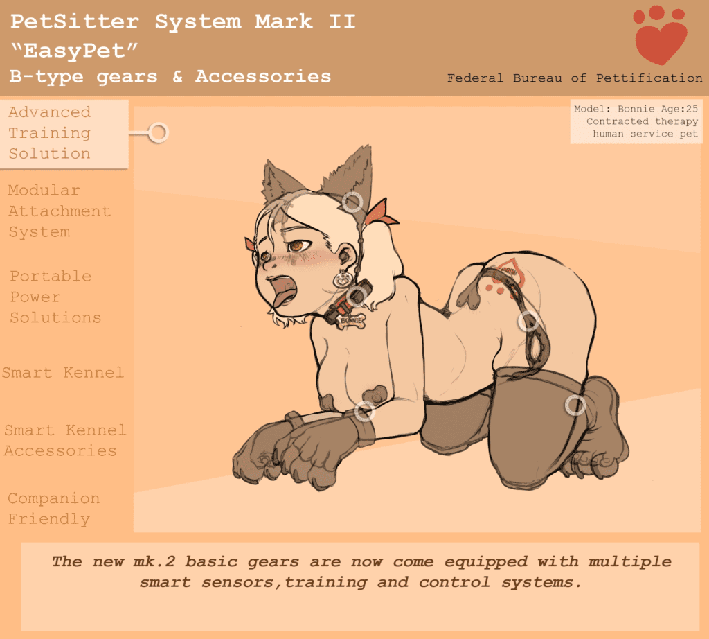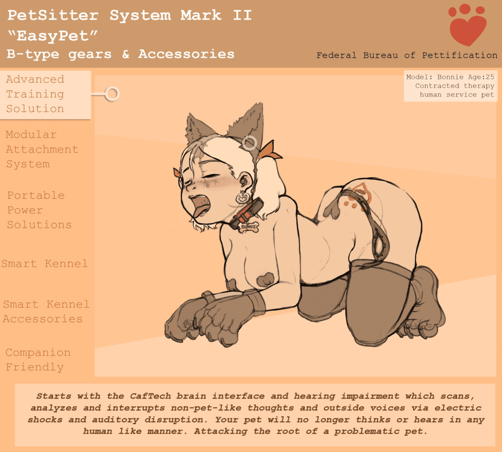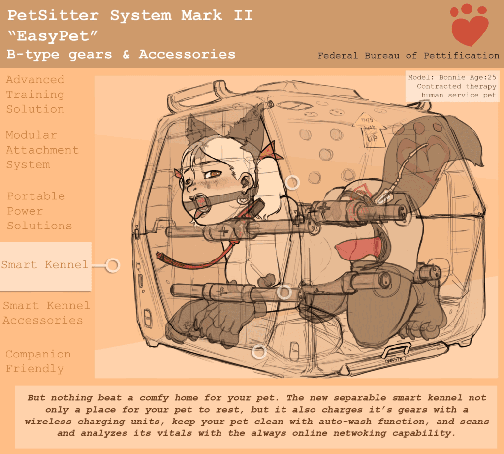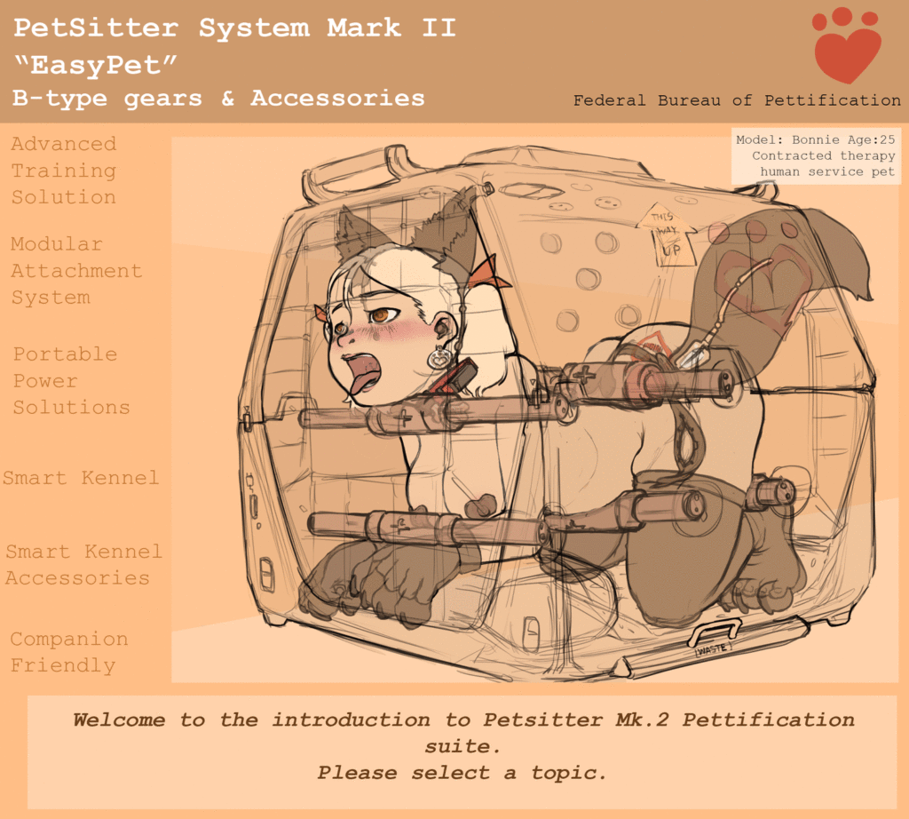 With the rapid increase in public demands from both domestic and foreign interests, finally comes the passing of the privatized pettification law. Under the regulation of the new Federal Bureau of Pettification (formerly Compulsory Pettification Bureau), a new and improved pettification system, the Petsitter Mk.2 “EasyPet” is released to the public.