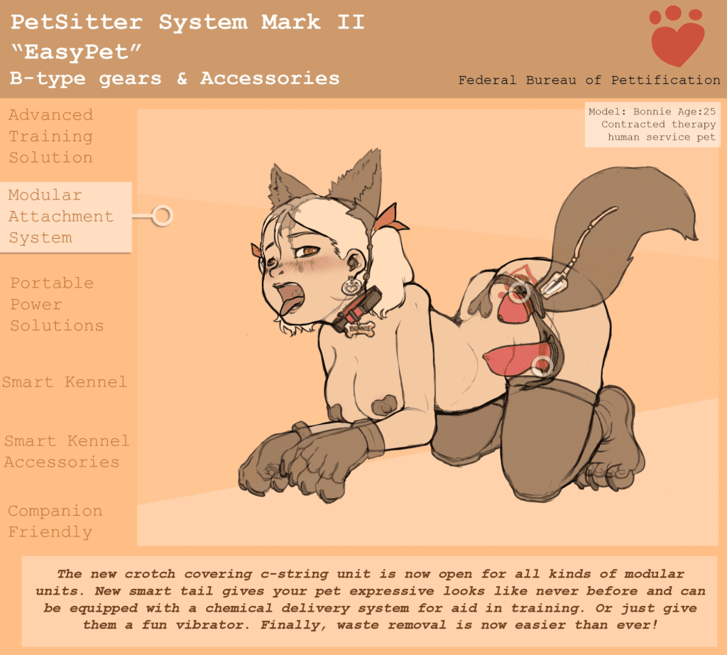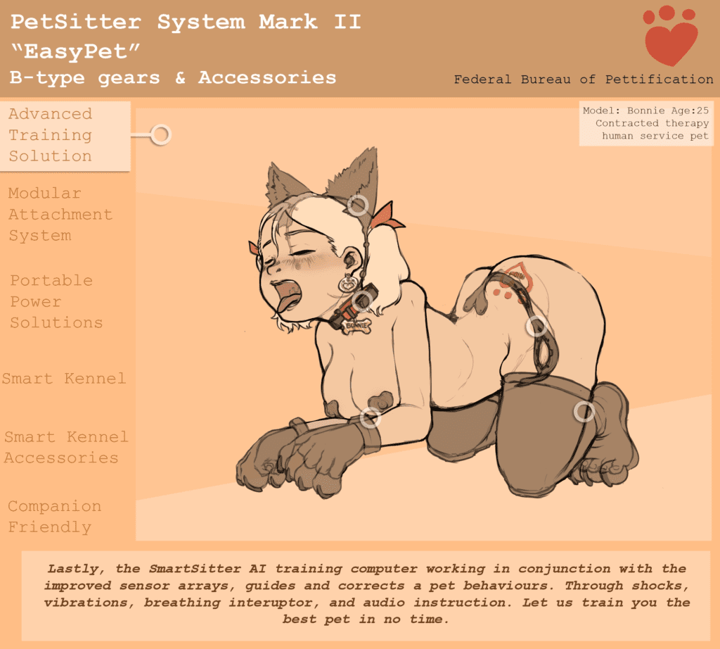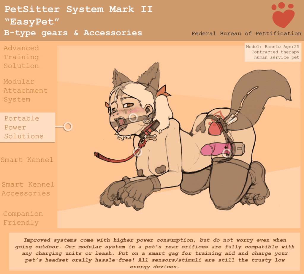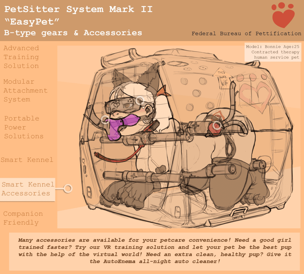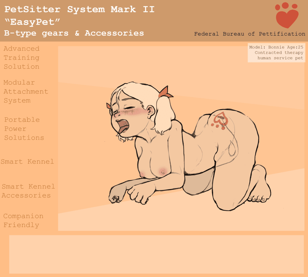 With the rapid increase in public demands from both domestic and foreign interests, finally comes the passing of the privatized pettification law. Under the regulation of the new Federal Bureau of Pettification (formerly Compulsory Pettification Bureau), a new and improved pettification system, the Petsitter Mk.2 “EasyPet” is released to the public.